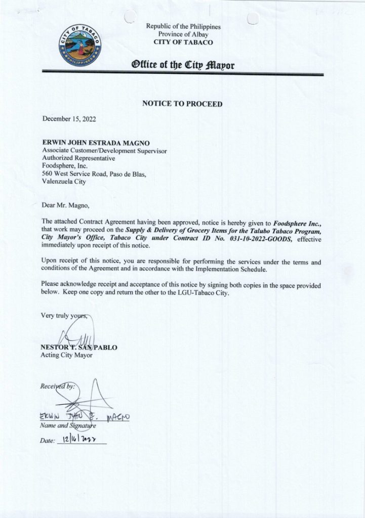 NOTICE TO PROCEED: Supply & Delivery of Grocery Items for the Talubo Tabaco Program, City Mayor’s Office, Tabaco City, Contract ID No. 031-10-2022-GOODS 2022, Bids and Awards - Posted by: [ Melissa Biron] Notice to Proceed-031Download Contract-031Download