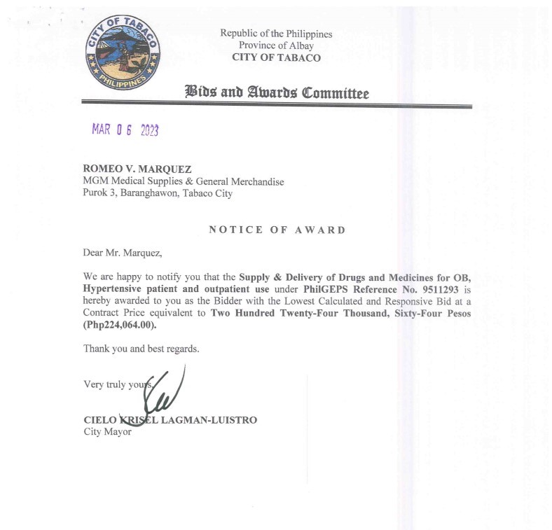 Notice of Award: Supply & Delivery of Drugs and Medicines for OB, Hypertensive patient and outpatient use, PR No.23-02-0026 2023, Bids and Awards - Posted by: [ Melissa Biron] Download: Notice of Award: PR No.23-02-0026-MGM Medical Supplies and MerchandiseDownload BAC-RESO: PR No.23-02-0026Download