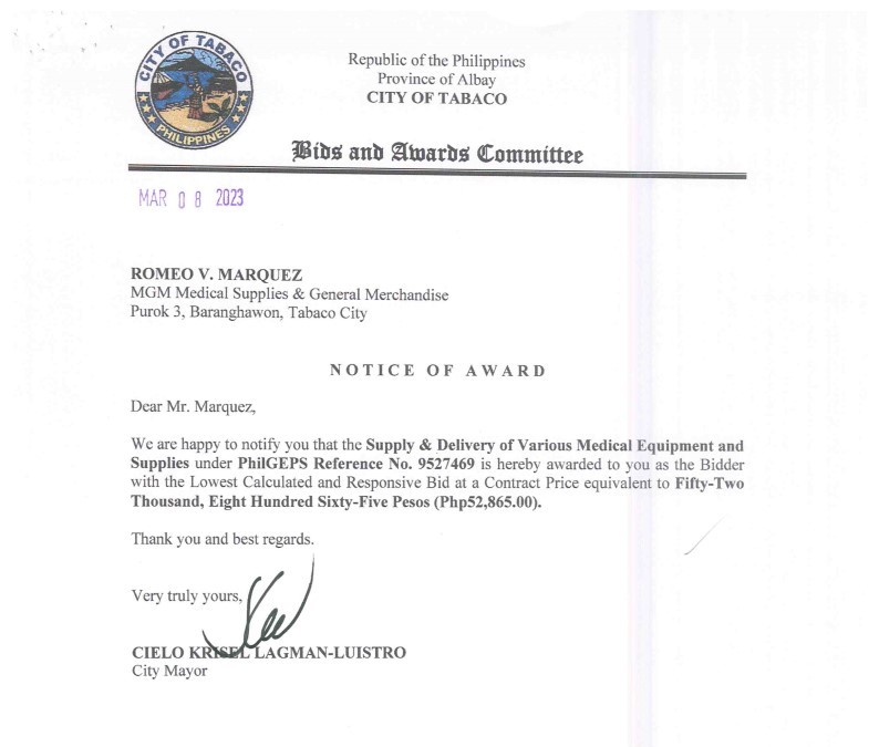 Notice of Award: Supply & Delivery of Various Medical Equipment and Supplies, PR No.23-02-0031