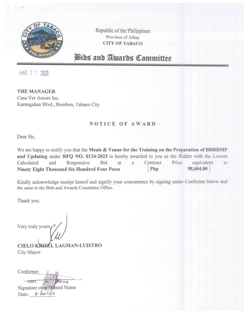 Notice of Award: Meals & Venue for the Training on the Preparation of BDRRMP and Updating, PR No.23-03-0156 2023, Bids and Awards - Posted by: [ Melissa Biron] Download: Notice of Award: PR No.23-03-0156-Casa Ver Amore Inc.Download BAC-RESO: PR No.23-03-0156Download