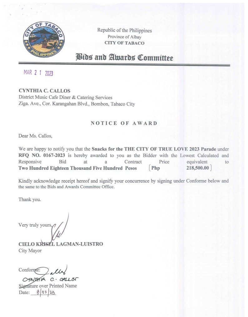 Notice of Award: Snacks for the, THE CITY OF TRUE LOVE 2023 Parade, PR No.23-03-0189 2022, Bids and Awards - Posted by: [ Melissa Biron] Download: Notice of Award: PR No.23-03-0189- District Music Cafe Diner & Catering ServicesDownload BAC-RESO: PR No.23-03-0189Download