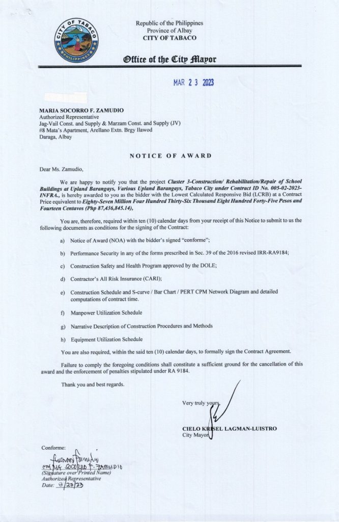 NOTICE OF AWARD: Cluster 3-Construction/ Rehabilitation/Repair of School Buildings at Upland Barangays, Various Upland Barangays, Tabaco City, Contract ID No. 005-02-2023-INFRA 2023, Bids and Awards - Posted by: [ Melissa Biron] Notice of Award-Jag-Vail Const. & Supply & Marzam Const. & Supply (JV)Download