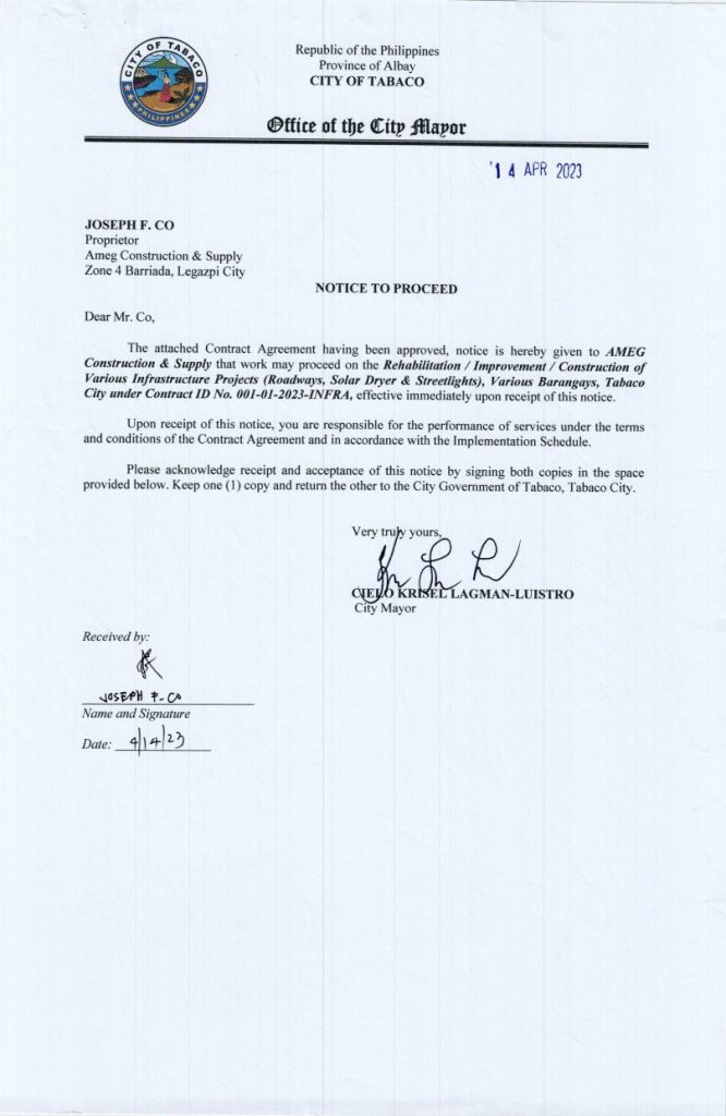 NOTICE TO PROCEED: Rehabilitation / Improvement / Construction of Various Infrastructure Projects (Roadways, Solar Dryer & Streetlights), Various Barangays, Tabaco City, Contract ID No. 001-01-2023-INFRA 2023, Bids and Awards - Posted by: [ Melissa Biron] Notice to Proceed-001Download Contract Agreement-001Download