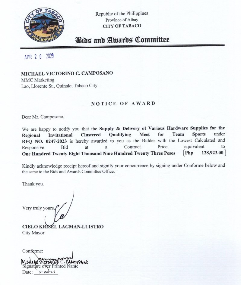Notice of Award: Supply & Delivery of Various Hardware Supplies for the Regional Invitational Clustered Qualifying Meet for Team Sports, PR No.23-04-0276
