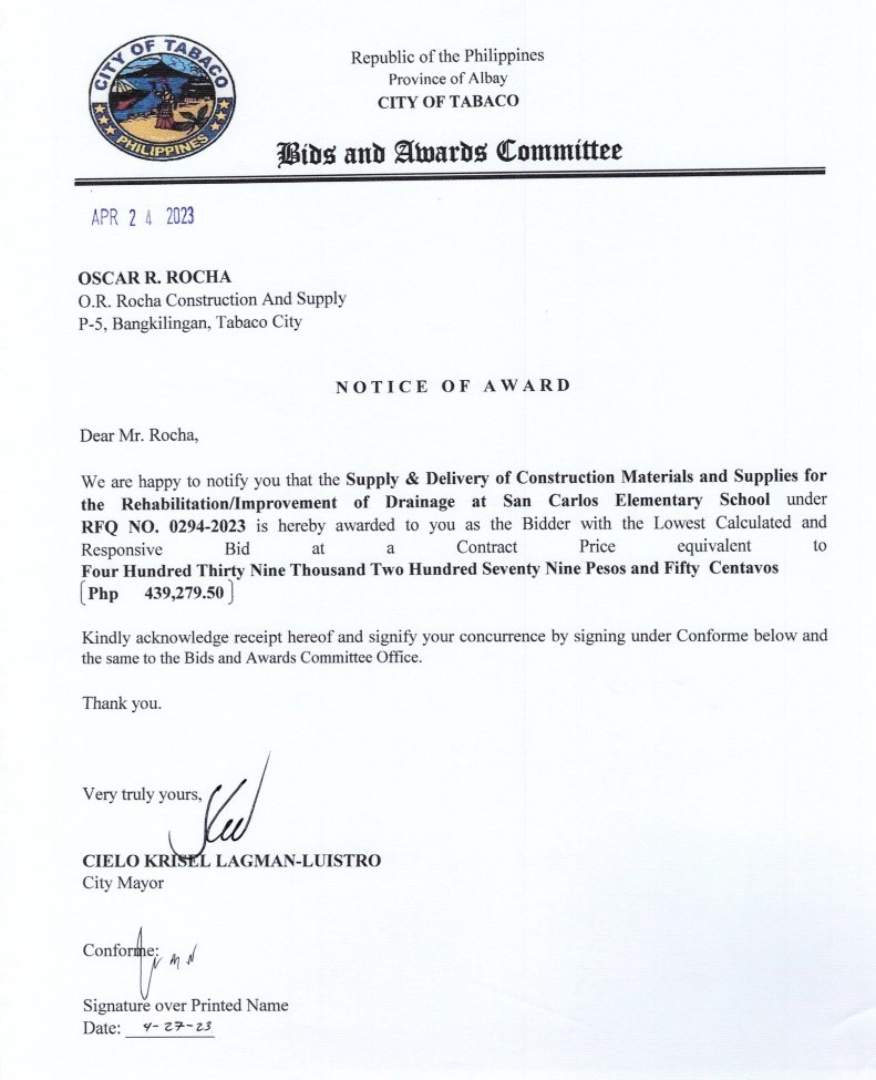 Notice of Award: Supply & Delivery of Construction Materials and Supplies for the Rehabilitation/Improvement of Drainage at San Carlos Elementary School, PR No.23-04-0327 2023, Bids and Awards - Posted by: [ Melissa Biron] Download: Bac-Reso: PR No.23-04-0327-O.R. Rocha Construction and SupplyDownload Notice of Award: PR No.23-04-0327-O.R. Rocha Construction and Supply Download Purchase Order: PR No.23-04-0327-O.R. Rocha Construction and Supply Download