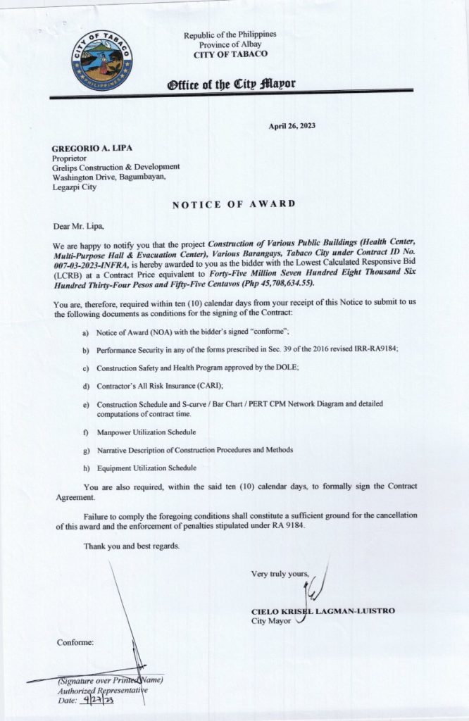 NOTICE OF AWARD: Construction of Various Public Buildings (Health Center, Multi-Purpose Hall & Evacuation Center), Various Barangays, Tabaco City, Contract ID No. 007-03-2023-INFRA 2023, Bids and Awards - Posted by: [ Melissa Biron] Notice of Award-Grelips Construction & SupplyDownload