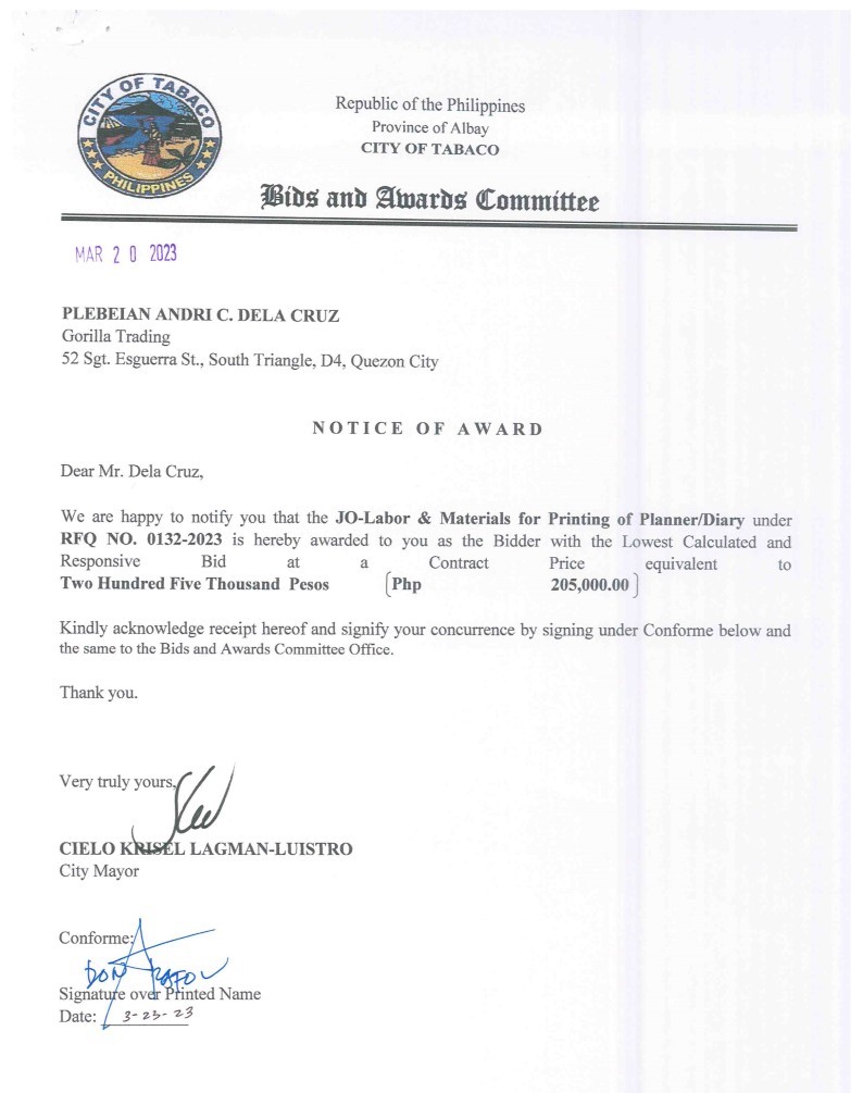 Notice of Award: JO- Labor & Materials for Printing of Planner/Diary, PR No.23-03-0154 2023, Bids and Awards - Posted by: [ Melissa Biron] Download: Notice of Award: PR No.23-03-0154- Gorilla TradingDownload BAC-RESO: PR No.23-03-0154Download