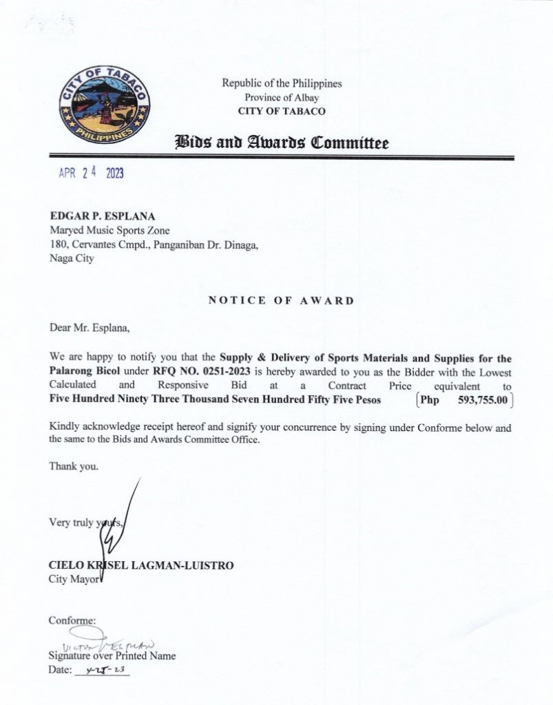 Notice of Award: Supply & Delivery of Sports Materials and Supplies for the Palarong Bicol, PR No.23-04-0280