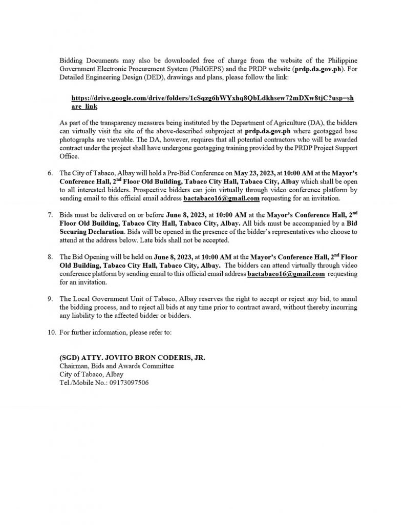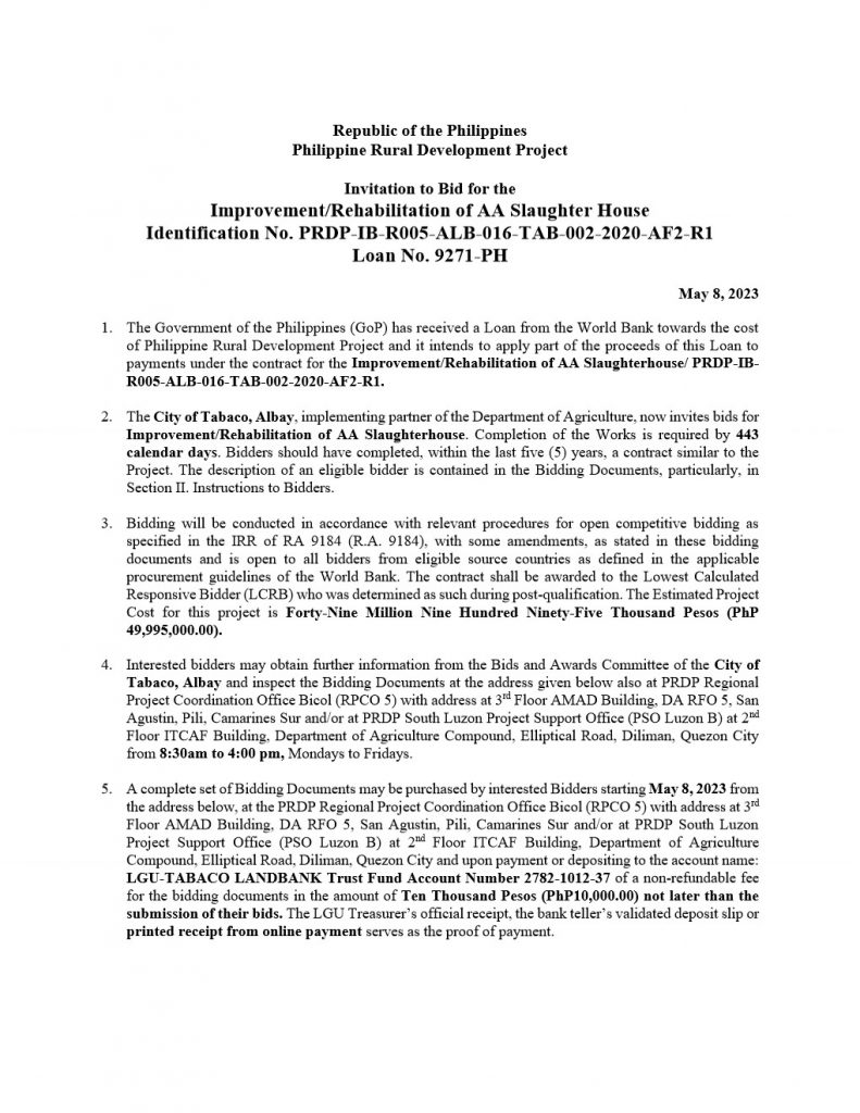 Improvement/Rehabilitation of AA Slaughter House, Identification No. PRDP-IB-R005-ALB-016-TAB-002-2020-AF2-R1, Loan No. 9271-PH 2023, Bids and Awards - Posted by: [ Melissa Biron] Philippine Bidding Documents: PBD_AA-Slaughterhouse_Tabaco_R1Download
