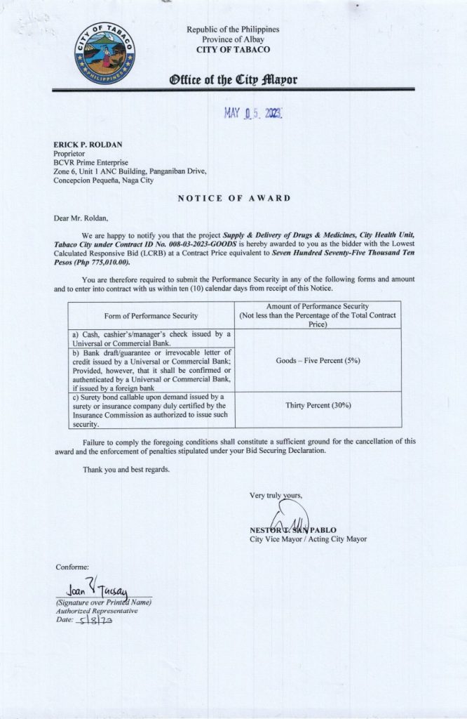 NOTICE OF AWARD: Supply & Delivery of Drugs & Medicines, City Health Unit, Tabaco City, Contract ID No. 008-03-2023-GOODS 2023, Bids and Awards - Posted by: [ Melissa Biron] Notice of Award-008, BCVR Prime EnterpriseDownload