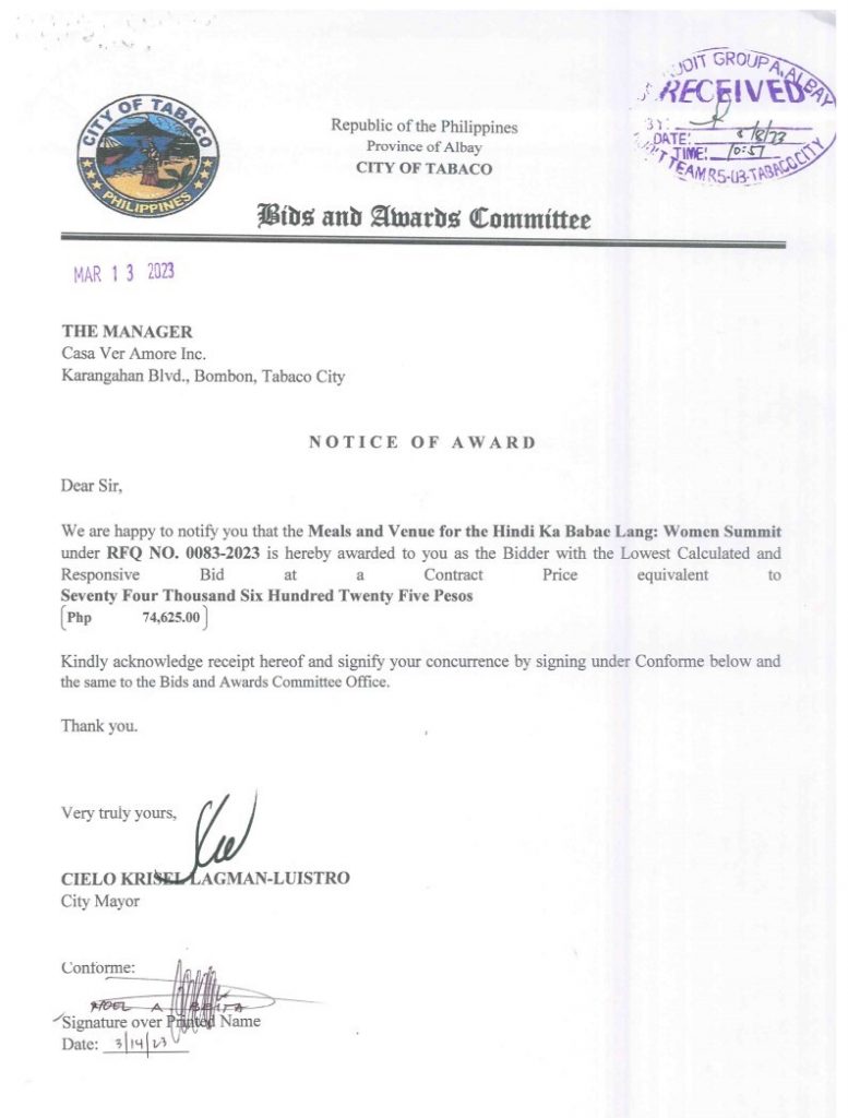 Notice of Award: Meals and Venue for the Hindi ka Babae Lang: Women Summit, PR No.23-03-0092 2022, Bids and Awards - Posted by: [ Melissa Biron] Download: Notice of Award: PR No.23-03-0082-Casa Ver Amore Inc.Download BAC-RESO: PR No.23-03-0082Download