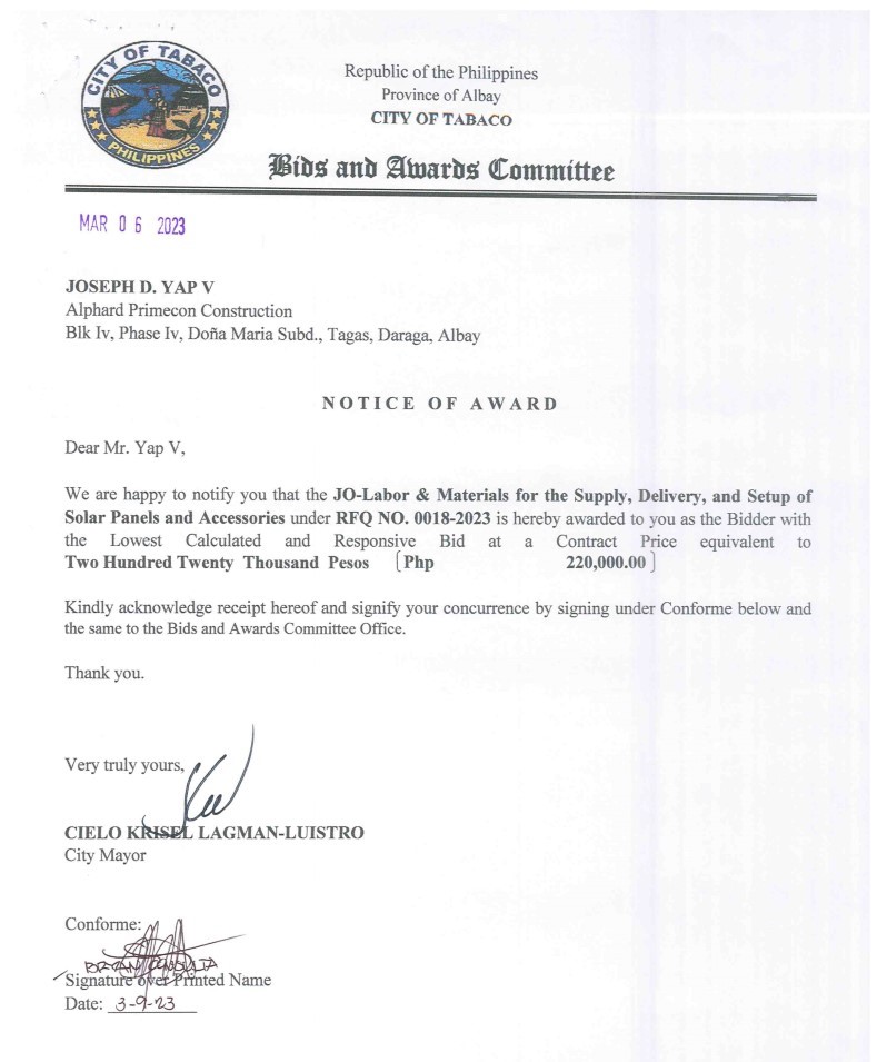 Notice of Award: JO- Labor & Materials for the Supply, Delivery and Setup of Solar Panels and Accessories, PR No.23-02-0025 2023, Bids and Awards - Posted by: [ Melissa Biron] Download: Notice of Award: PR No.23-02-0025- Alphard Primecon ConstructionDownload BAC-RESO: PR No.23-02-0025Download
