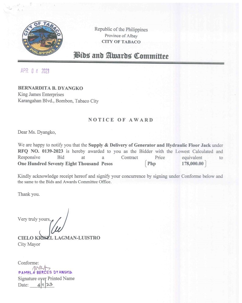 Notice of Award: Supply & Delivery of Generator and Hydraulic Floor Jack, PR No.23-03-0161