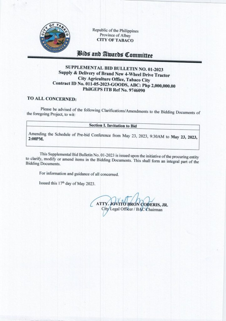 Supplemental Bid Bulletin No. 01-2023: Supply & Delivery of Brand New 4-Wheel Drive Tractor, City, Agriculture Office, Tabaco City, Contract ID No. 011-05-2023-GOODS 2023, Bids and Awards - Posted by: [ Melissa Biron] Supplemental-Bid-Bulletin-No.-01-2023Download
