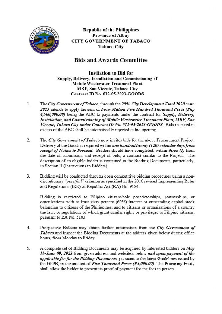 Invitation to Bid: Supply, Delivery, Installation and Commissioning of Mobile Wastewater Treatment Plant, MRF, San Vicente, Tabaco City, Contract ID No. 012-05-2023-GOODS