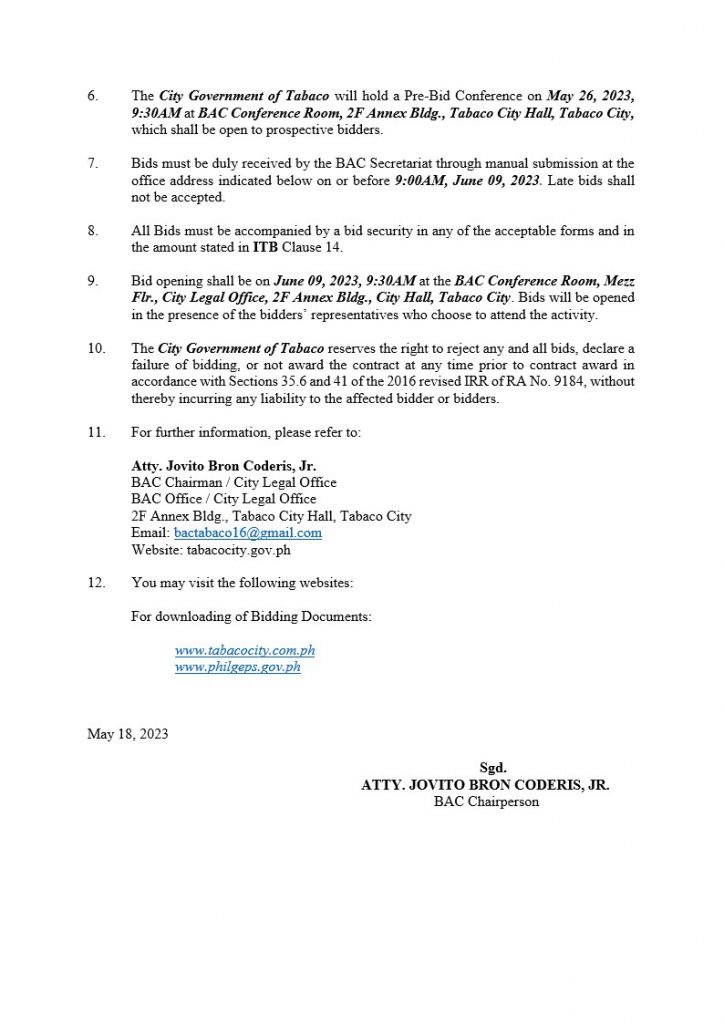 • REQUEST FOR QUOTATION (RFQ)- The City Government of Tabaco through its Bids and Awards Committee (BAC), intends to procure "Supply & Delivery of Construction Materials for the Rehabilitation / Repair of Damaged Infrastructure Facilities and Evacuation Centers at Brgy. Buang and San Vicente,Tabaco City" with an Approved Budget for the Contract (ABC) amounting to Two Hundred Ninety-Nine Thousand, Nine Hundred Ninety-Six Pesos (Php 299,996.00) through Section 34 Small Value Procurement of the Implementing Rules and Regulations of RA No. 12009.