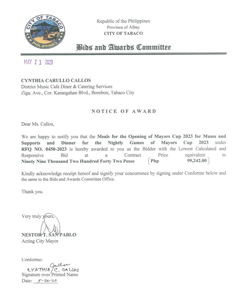 Notice of Award: Meals for the Opening of Mayors Cup 2023 for Muses and Supports and Dinner for the Nightly Games of Mayors Cup 2023, PR No.23-05-0505 2023, Bids and Awards - Posted by: [ Melissa Biron] Download: Bac-Reso: PR No.23-05-0505-District Music Cafe Diner Catering ServicesDownload Notice Of Award: PR No.23-05-0505 District Music Cafe Diner Catering Services Download Purchase Order: PR No.23-05-0505-District Music Cafe Diner Catering Services Download