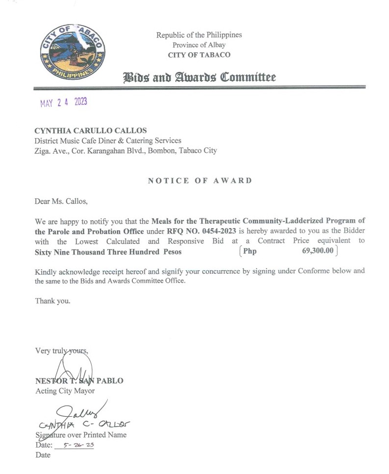 • NOTICE OF AWARD TO DISTRICT MUSIC CAFE DINNER AND CATERING SERVICES FOR "Supply & Delivery of Meals for the Digital Literacy Training Program of the Tabaco City Library (4 Batches)" with an Approved Budget for the Contract (ABC) amounting to Two Hundred Fifty-Nine Thousand, Two Hundred Pesos (Php 259,200.00) through Section 34 Small Value Procurement of the Implementing Rules and Regulations of RA No. 12009.