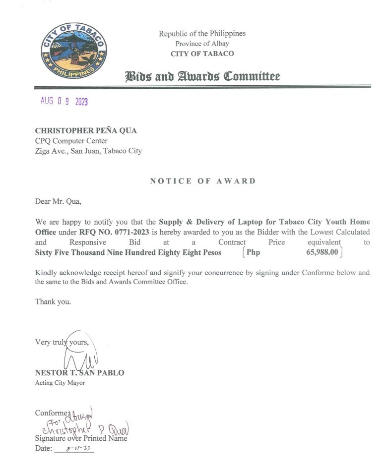 Notice of Award: Supply & Delivery of Laptop for Tabaco City Youth Home Office, PR No.23-07-0878
