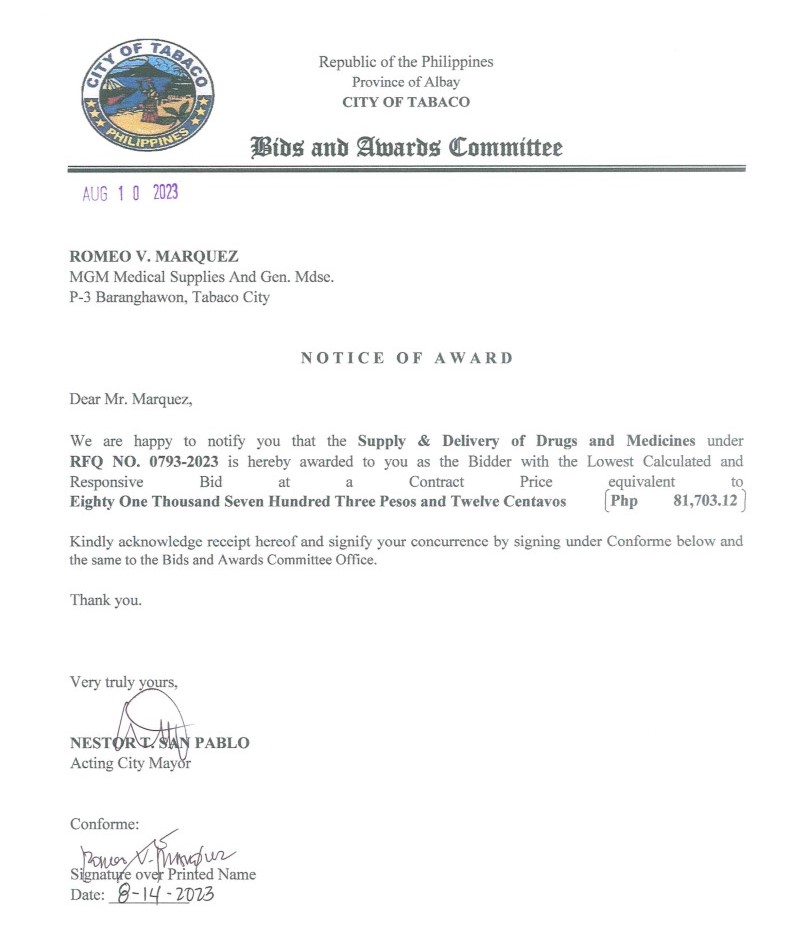 Notice of Award: Supply & Delivery of Drugs and Medicines, PR No.23-07-0911 2023, Bids and Awards - Posted by: [ Melissa Biron] Download: Bac-Reso: PR No.23-07-0911-MGM Medical Supplies & Gen. Mdse. Download Notice of Award: PR No.23-07-0911-MGM Medical Supplies & Gen. Mdse.Download Purchase Order: PR No.23-07-0911-MGM Medical Supplies & Gen. Mdse. Download