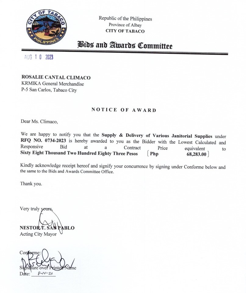 • REQUEST FOR QUOTATION (RFQ)- The City Government of Tabaco through its Bids and Awards Committee (BAC), intends to procure "Job Order: Labor & Materials for Fabrication and Installation of Furniture and Fixture at Legislative Building, Karangahan, Tabaco City" with an Approved Budget for the Contract (ABC) amounting to One Million, Five Hundred Thousand Pesos (Php 1,500,000.00) through Section 34 Small Value Procurement of the Implementing Rules and Regulations of RA No. 12009.