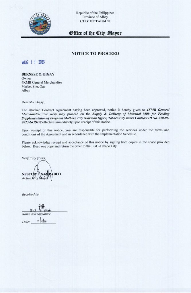 NOTICE TO PROCEED: Supply & Delivery of Maternal Milk for Feeding Supplementation of Pregnant Mothers, City Nutrition Office, Tabaco City, Contract ID No. 020-06-2023-GOODS