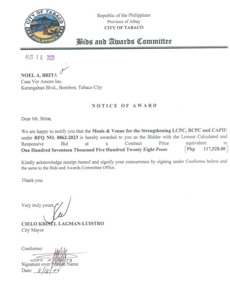 Notice of Award: Meals & Venue for the Strengthening LCPC, BCPC and CAPIU, PR No.23-08-0996 2023, Bids and Awards - Posted by: [ Melissa Biron] Download: Bac-Reso: PR No.23-08-0996-Casa Ver Amore, Inc. Download Notice of Award: PR No.23-08-0996-Casa Ver Amore, Inc.Download Purchase Order: PR No.23-08-0996-Casa Ver Amore, Inc. Download
