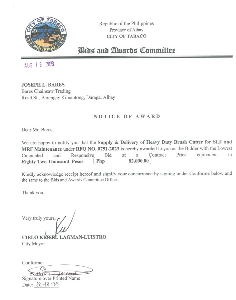 • NOTICE OF AWARD (NOA)- TO O.R. ROCHA CONSTRUCTIONS AND SUPPLY FOR "Job Order-Labor, Materials and Equipment for the Fabrication and Installation of Early Warning Device / Signages" with an Approved Budget for the Contract (ABC) amounting to Nine Hundred Ninety-Nine Thousand, Eight Hundred Eighteen Pesos (Php 999,818.00) through Section 34 Small Value Procurement of the Implementing Rules and Regulations of RA No. 12009.