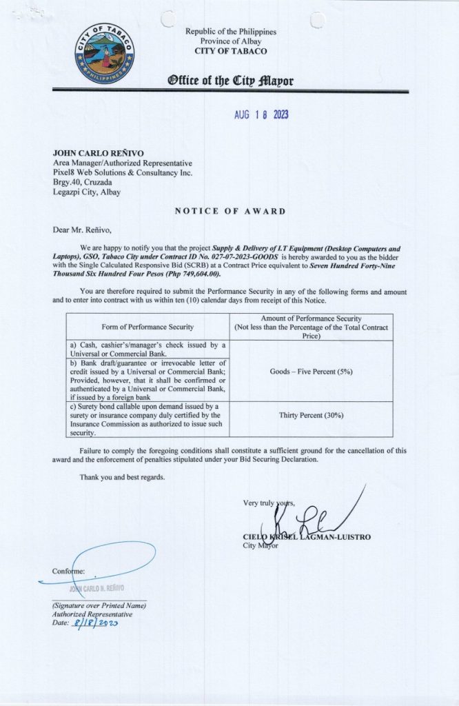 NOTICE OF AWARD: Supply & Delivery of I.T. Equipment (Desktop Computers and Laptops), GSO, Tabaco City, Contract ID No. 027-07-2023-GOODS 2023, Bids and Awards - Posted by: [ Melissa Biron] Notice of Award-027Download BAC Resolution-Award-027Download