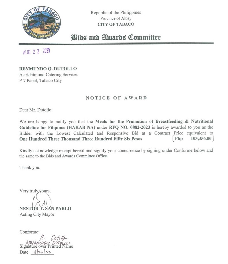 Notice of Award: Meals for the Promotion of Breastfeeding & Nutritional Guideline for Filipinos (HAKAB NA), PR No.23-08-1017 2023, Bids and Awards - Posted by: [ Melissa Biron] Download: Bac-Reso: PR No,23-08-1017-Astridaimond Catering ServicesDownload Notice of Award: PR No.23-08-1017-Astridaimond Catering Services Download Purchase Order: PR No.23-08-1017-Astridaimond Catering Services Download