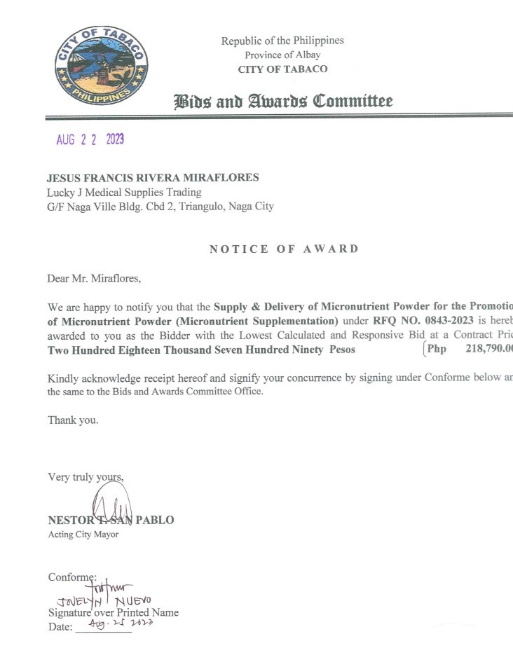 • INVITATION TO BID (ITB)- The City Government of Tabaco, through the GF MOOE (GAD 2026) intends to apply the sum of One Million One Hundred Thirty Thousand Five Hundred Eighty Pesos and 00/100 (Php1,130,580.00) being the Approved Budget for the Contract (ABC), to payments under the contract for Supply and Delivery of Feeding Supplementation for Senior Citizens (Fuel for Seniors & TB Warriors) with Contract ID CB_GOODS_2026-04-0002.