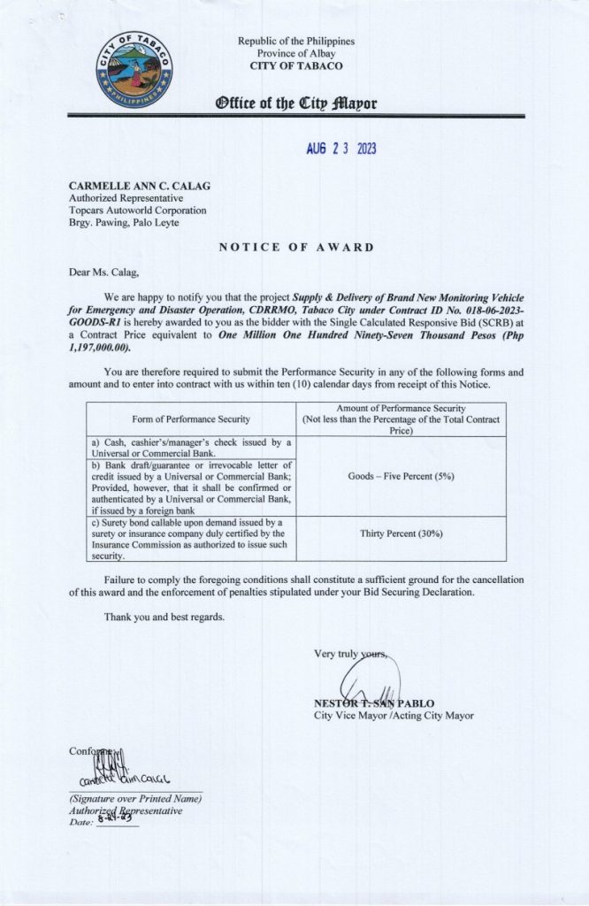 NOTICE OF AWARD: Supply & Delivery of Brand New Monitoring Vehicle for Emergency and Disaster Operation CDRRMO, Tabaco City, Contract ID No. 018-06-2023-GOODS-R1