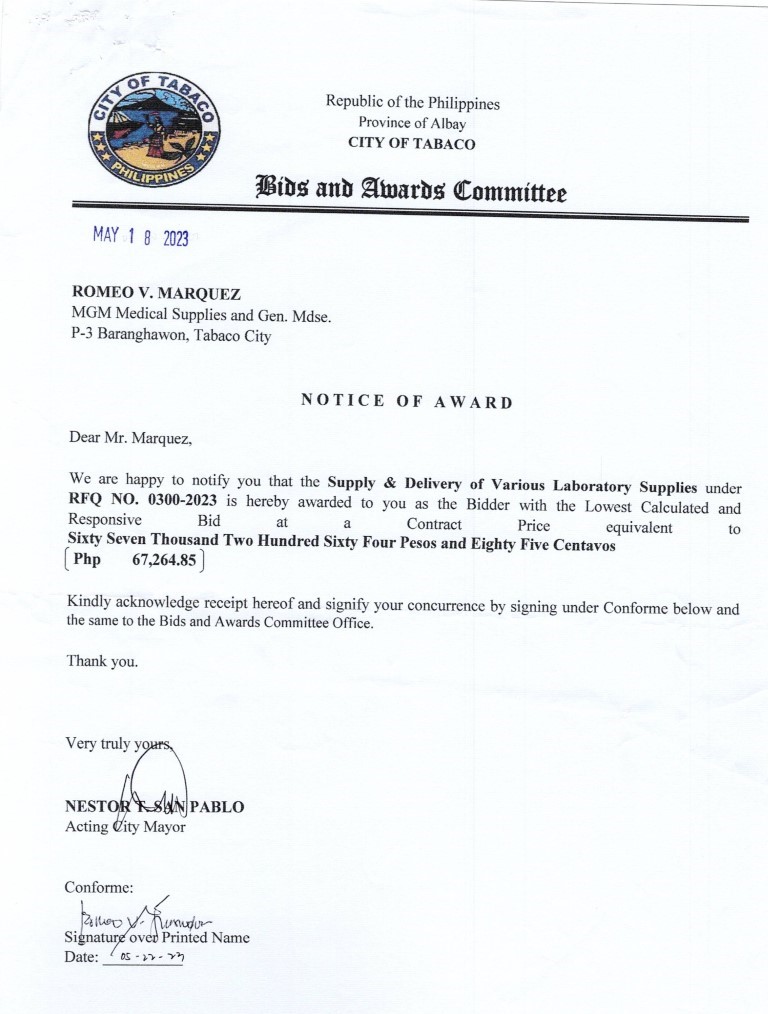 Notice of Award: Supply & Delivery of Various Laboratory Supplies, PR No.23-04-0336 2023, Bids and Awards - Posted by: [ Melissa Biron] Notice of Award: PR No.23-04-0336- MGM Medical Supplies and Gen. Mdse.Download BAC-RESO: PR No.23-04-0336Download