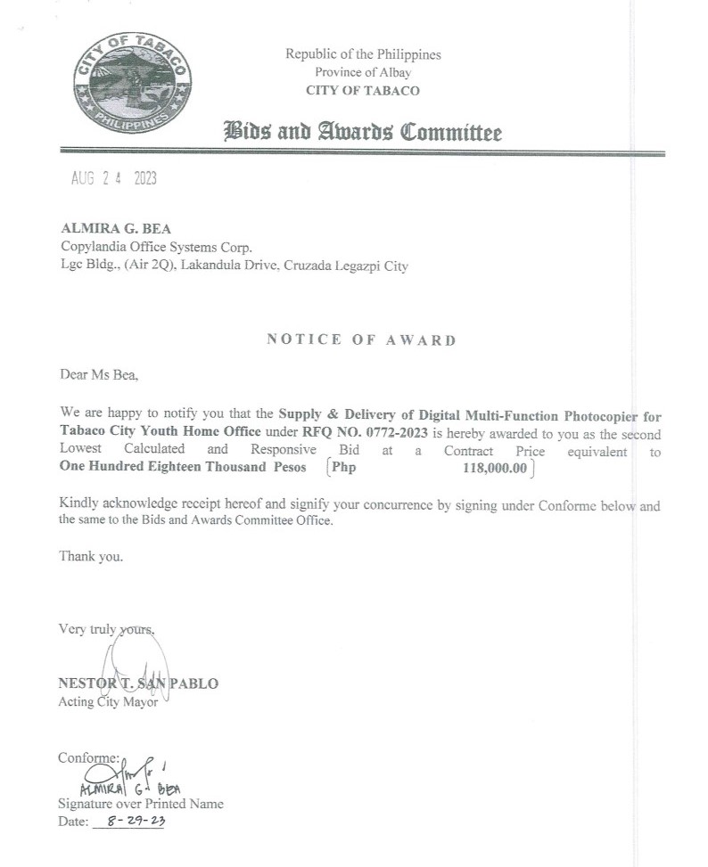 Notice of Award: Supply & Delivery of Digital Multi-Function Photocopier for Tabaco City Youth Home Office, PR No.23-07-0879 2023, Bids and Awards - Posted by: [ Melissa Biron] Download: Bac-Reso: PR No.23-07-0879-Copylandia Office System Corp.Download Notice of Award: PR No.23-07-0879-Copylandia Office System Corp. Download Purchase Order: PR No.23-07-0879-Copylandia Office System Corp. Download