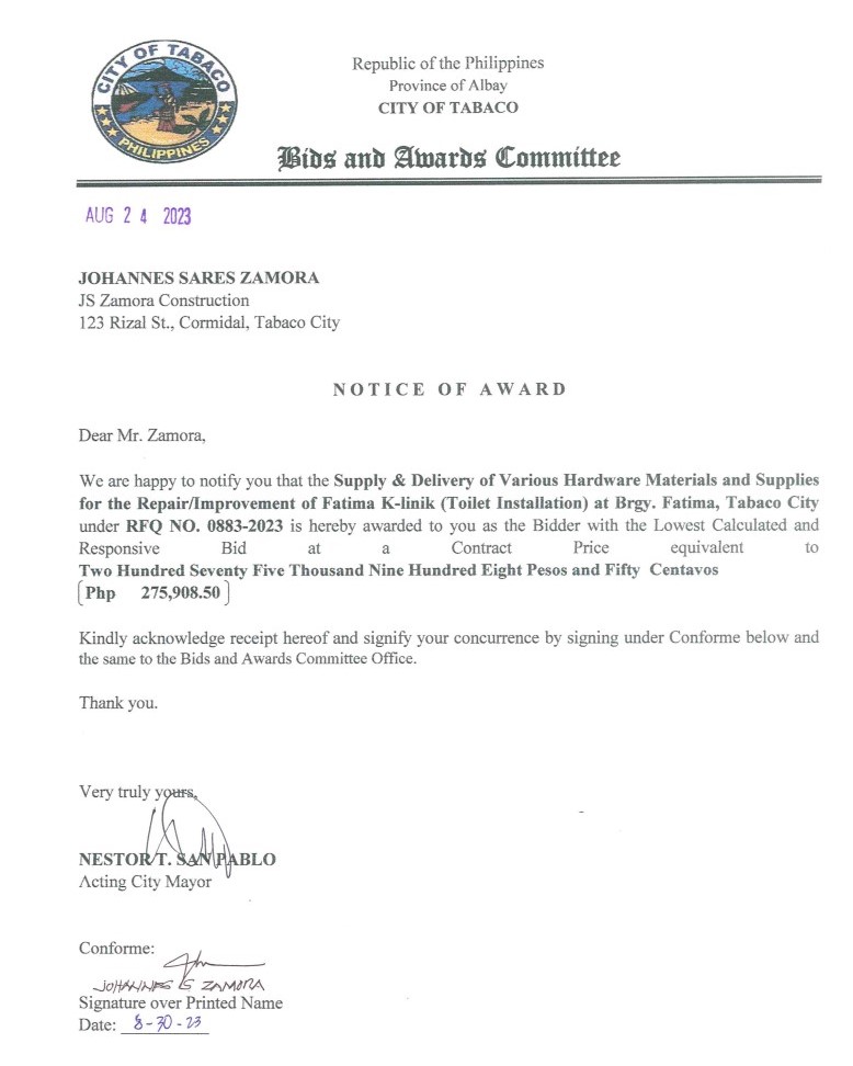 Notice of Award: Supply & Delivery of Various Hardware Materials and Supplies for the Repair/Improvement of Fatima K-linik (Toilet Installation) at Brgy. Fatima, Tabaco City, PR No.23-08-1018 2023, Bids and Awards - Posted by: [ Melissa Biron] Download: Bac-Reso: PR No.23-08-1018-JS Zamora ConstructionDownload Notice of Award: PR No.23-08-1018-JS Zamora Construction Download Purchase Order: PR No.23-08-1018-JS Zamora Construction Download