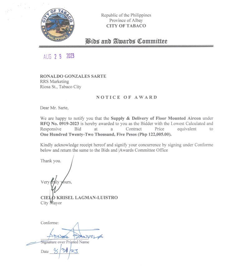 Notice of Award: Supply & Delivery of Floor Mounted Aircon, PR No.23-08-1061 2023, Bids and Awards - Posted by: [ Melissa Biron] Download: Bac-Reso: PR No.23-08-1061-RRS MarketingDownload Notice of Award: PR No.23-08-1061-RRS Marketing Download Purchase Order: PR No.23-08-1061-RRS Marketing Download
