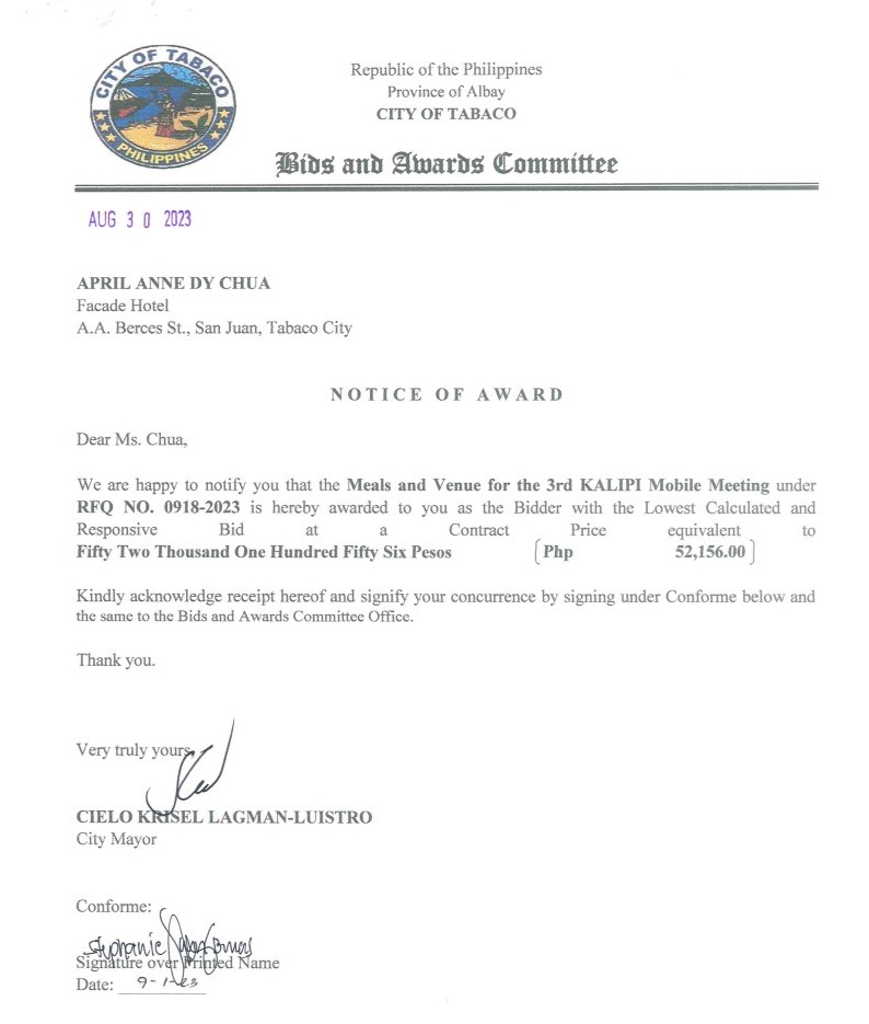 Notice of Award: Meals and Venue for the 3rd KALIPI Mobile Meeting, PR No.23-08-1060 2023, Bids and Awards - Posted by: [ Melissa Biron] Download: Bac-Reso: PR No.23-08-1060-Facade Hotel Download Notice of Award: PR No.23-08-1060-Facade Hotel Download Purchase Order: PR No.23-08-1060-Facade HotelDownload
