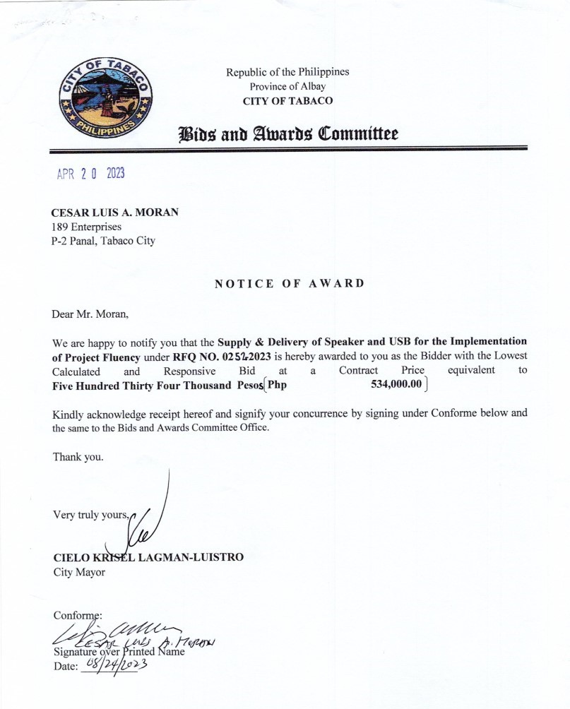 Notice of Award: Supply & Delivery of Speaker and USB for the Implementation of Project Fluency, PR No.23-04-0281 2023, Bids and Awards - Posted by: [ Melissa Biron] Notice of Award: PR No.23-04-0281- 189 EnterprisesDownload BAC-RESO: PR No.23-04-0281Download