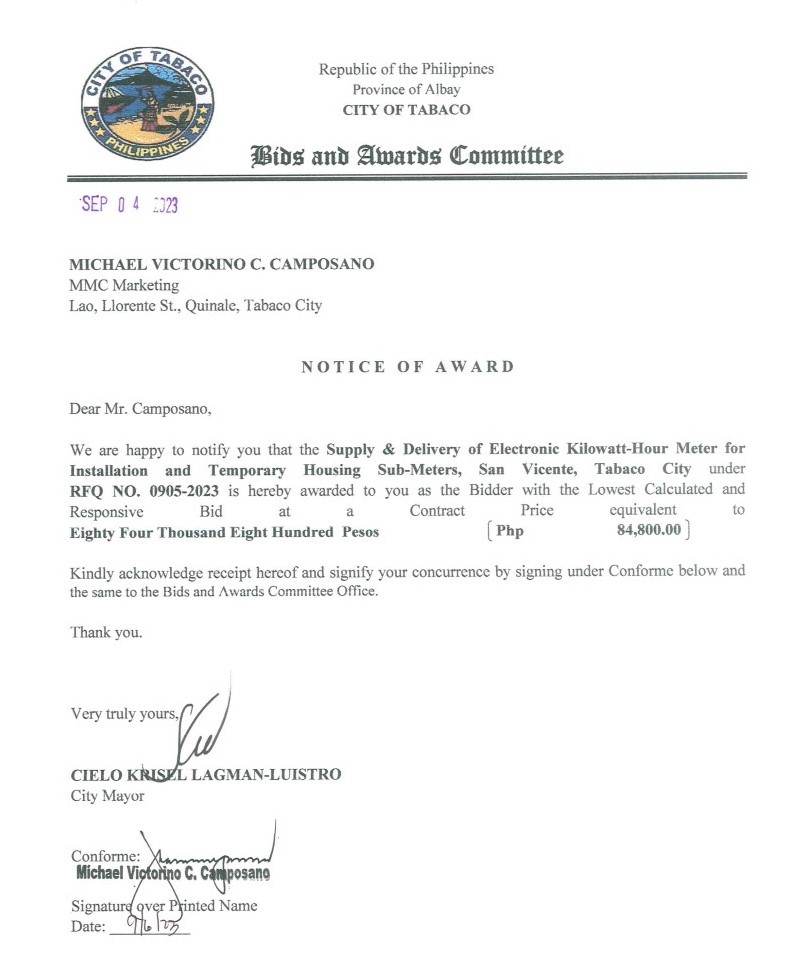 Notice of Award: Supply & Delivery of Electronic Kilowatt-Hour Meter for Installation and Temporary Housing Sub-Meters, San Vicente, Tabaco City, PR No.23-08-1046