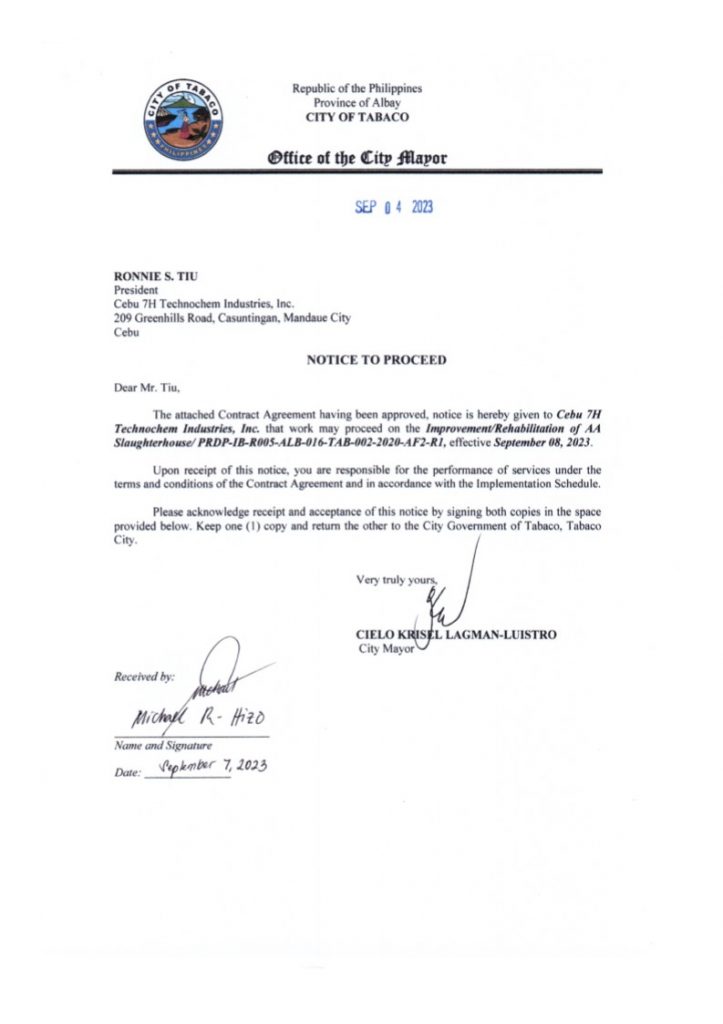 NOTICE TO PROCEED: Improvement/Rehabilitation of AA Slaughterhouse/ PRDP-IB-R005-ALB-016-TAB-002-2020-AF2-R1 2023, Bids and Awards - Posted by: [ Melissa Biron] Notice to ProceedDownload Contract AgreementDownload