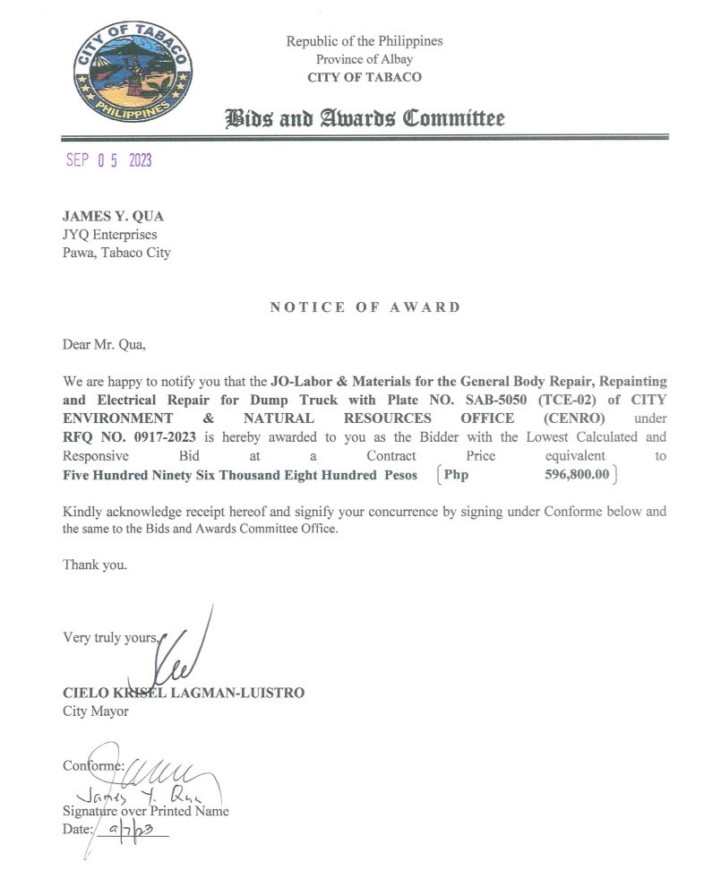 Notice of Award: JO-Labor & Materials for the General Body Repair, Repainting and Electrical Repair for Dump Truck with Plate NO. SAB-5050 (TCE-02) of CENRO, PR No.23-08-1059 2023, Bids and Awards - Posted by: [ Melissa Biron] Download: Bac-Reso: PR No.23-08-1059-JYQ EnterprisesDownload Notice of Award: PR No.23-08-1059-JYQ Enterprises Download Purchase Order: PR No.23-08-1059-JYQ Enterprises Download