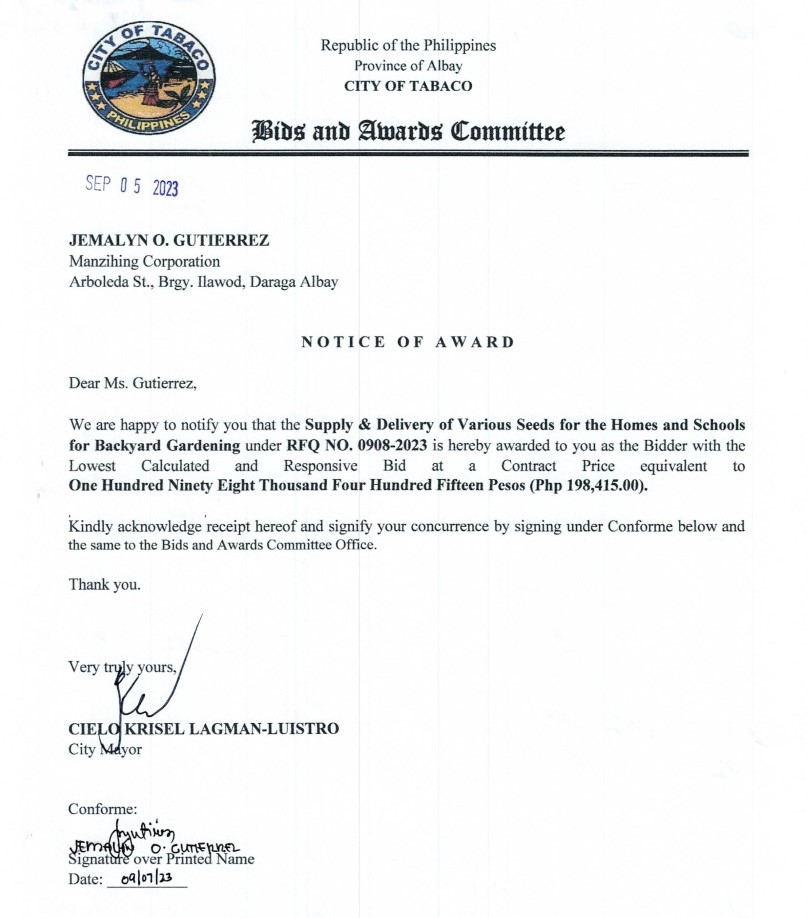 Notice of Award: Supply & Delivery of Various Seeds for the Homes and Schools for Backyard Gardening, PR No.23-08-1049 2023, Bids and Awards - Posted by: [ Melissa Biron] Download: Bac-Reso: PR No.23-08-1049-Manzihing CorporationDownload Notice of Award: PR No.23-08-1049-Manzihing Corporation Download Purchase Order: PR No.23-08-1049-Manzihing Corporation Download
