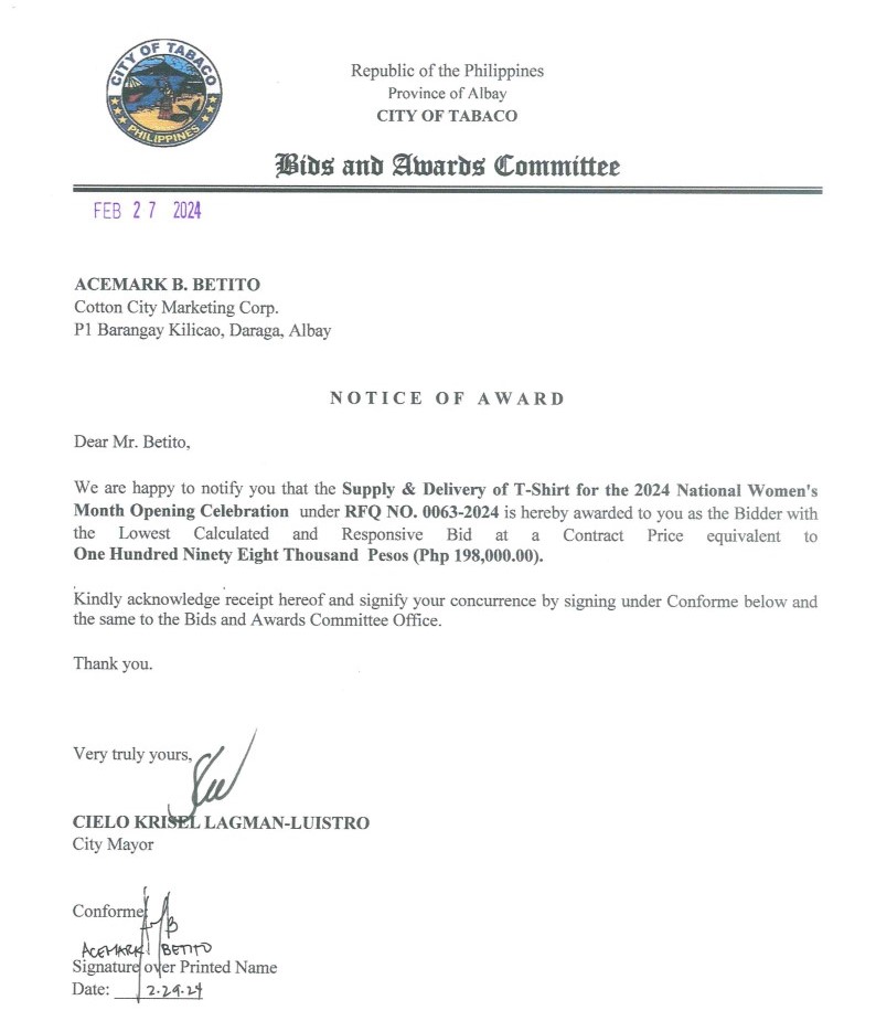 Notice of Award: Supply & Delivery of T-Shirt for the 2024 National Women’s Month Opening Celebration, PR No.24-02-0063 2024, Bids and Awards - Posted by: [ Melissa Biron] Download: Award-Reso: PR No.24-02-0063- Cotton City Marketing Corp.Download Notice of Award: PR No.24-02-0063- Cotton City Marketing Corp. Download Purchase Order: PR No.24-02-0063- Cotton City Marketing Corp. Download
