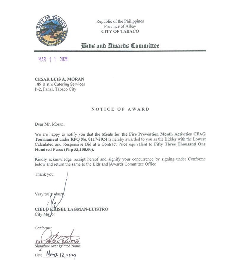 Notice of Award: PR No.24-02-0123-189 Bistro Catering Services Download