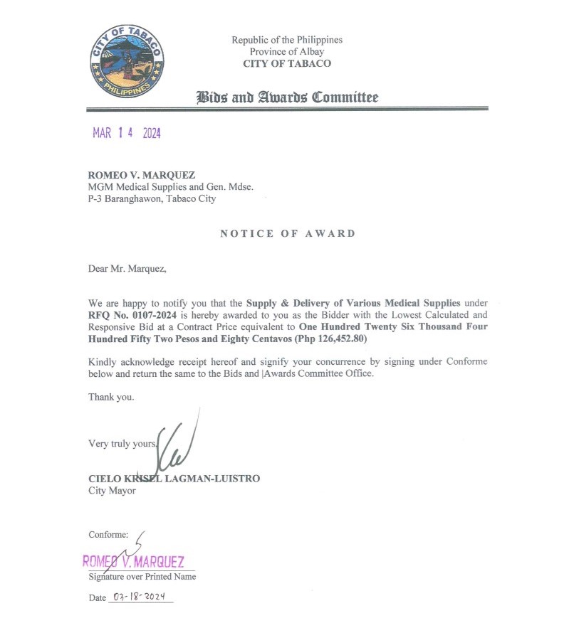 Notice of Award: Supply & Delivery of Various Medical Supplies, PR No. 24-02-0113 2024, Bids and Awards - Posted by: [ Melissa Biron] Download: Award Reso-24-02-0113 – MGM Medical Supplies & Gen. Mdse.Download NOA-24-02-0113 – MGM Medical Supplies & Gen. Mdse. Download PO-24-02-0113 – MGM Medical Supplies & Gen. Mdse. Download