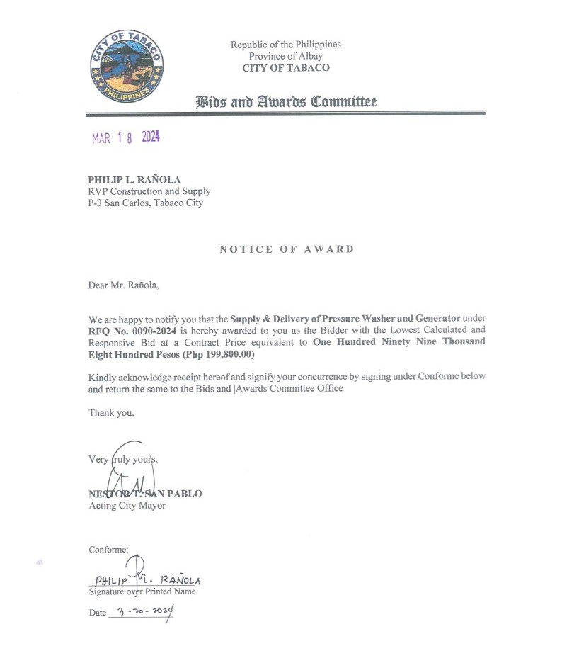 • NOTICE OF AWARD (NOA)- TO O.R. ROCHA CONSTRUCTIONS AND SUPPLY FOR "Job Order-Labor, Materials and Equipment for the Fabrication and Installation of Early Warning Device / Signages" with an Approved Budget for the Contract (ABC) amounting to Nine Hundred Ninety-Nine Thousand, Eight Hundred Eighteen Pesos (Php 999,818.00) through Section 34 Small Value Procurement of the Implementing Rules and Regulations of RA No. 12009.