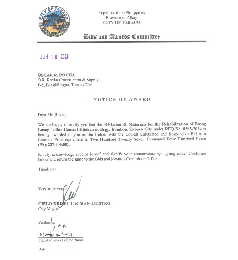 Notice of Award: JO-Labor & Materials for the Rehabilitation of Busog Lusog Talino Central Kitchen at Brgy. Bombon, Tabaco City, PR No. 24-05-0626 2024, Bids and Awards - Posted by: [ Melissa Biron] Download: Award Reso-24-05-0626 – O.R. Rocha Construction & Supply Download NOA-24-05-0626 – O.R. Rocha Construction & Supply Download PO-24-05-0626 – O.R. Rocha Construction & SupplyDownload