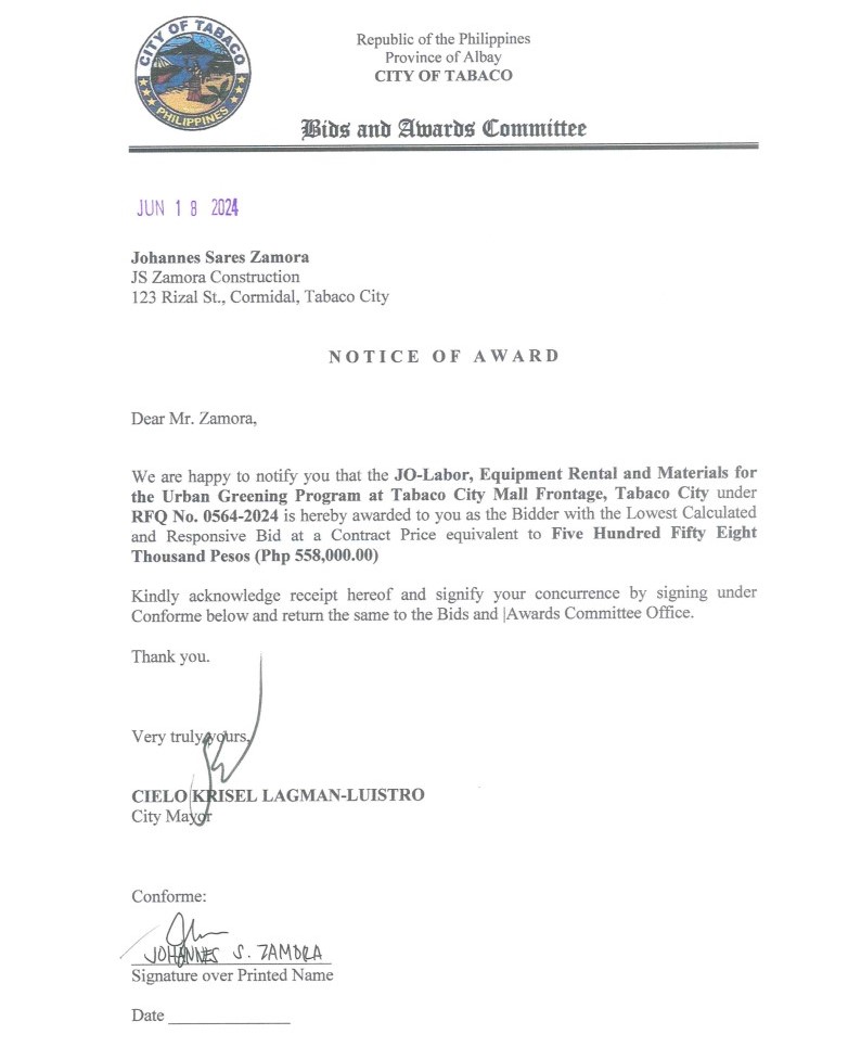 Notice of Award: JO-Labor, Equipment Rental & Materials for the Urban Greening Program at Tabaco City Mall Frontage, Tabaco City, PR No. 24-05-0627