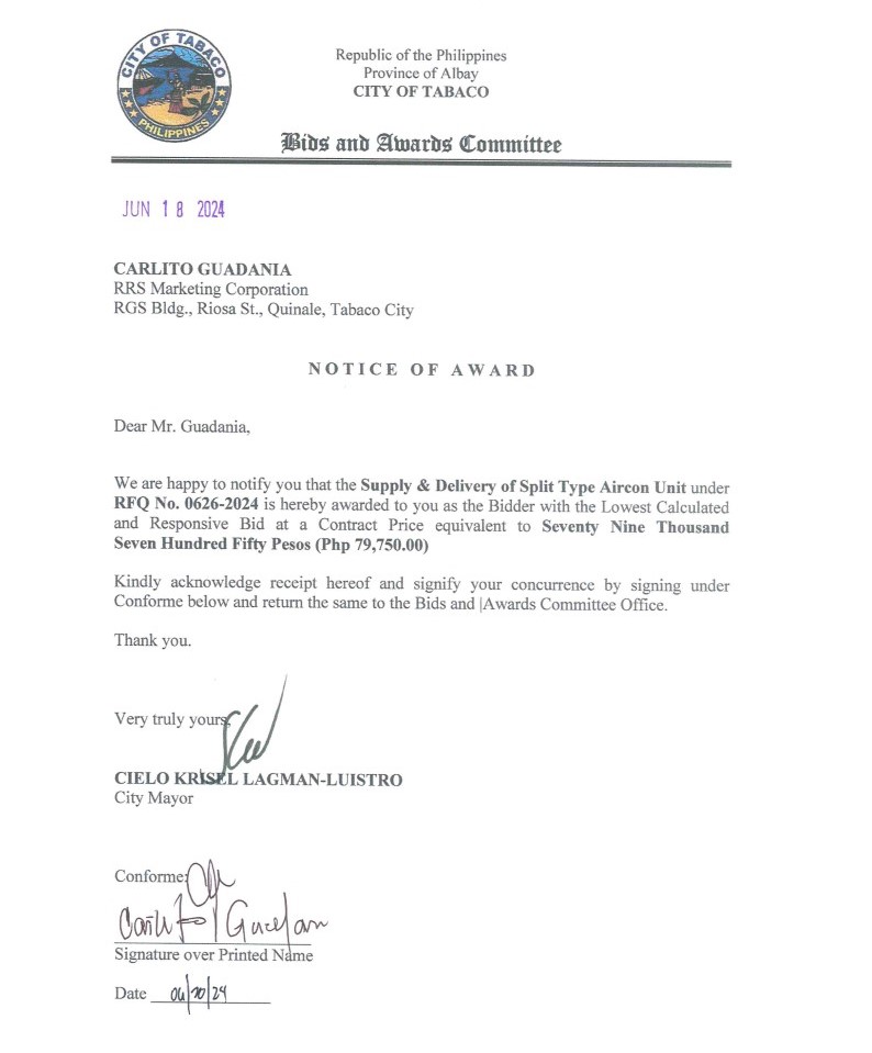 Notice of Award: Supply & Delivery of Split Type Aircon Unit, PR No. 24-06-0701