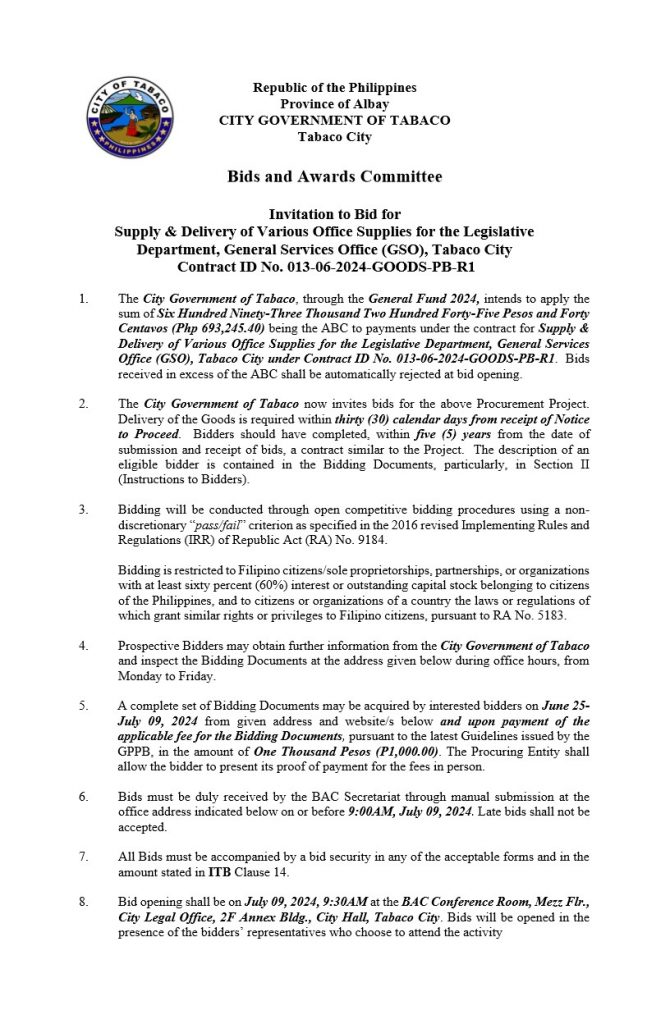 Invitation to Bid: Supply & Delivery of Various Office Supplies for the Legislative Department, General Services Office (GSO), Tabaco City, Contract ID No. 013-06-2024-GOODS-PB-R1